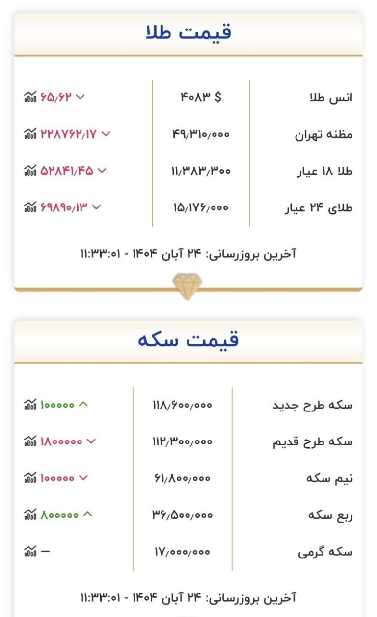 فوری🔻طلای ۱۸ عیار: 19,654,785 تومان(حباب 2.03%) ________ 🔺تتر: 161,353 تومان🔴 انس نقره : 114.80 دلار🔻سکه بهار آزادی: 198,280,000 تومان🔻سکه امامی: 202,602,500 تومان🔻نیم سکه: 104,045,000 تومان🔻ربع سکه: 56,550,000 تومان🔻اونس طلا: 4,893$ ساعت: 19:38تاریخ: 1404/11/11